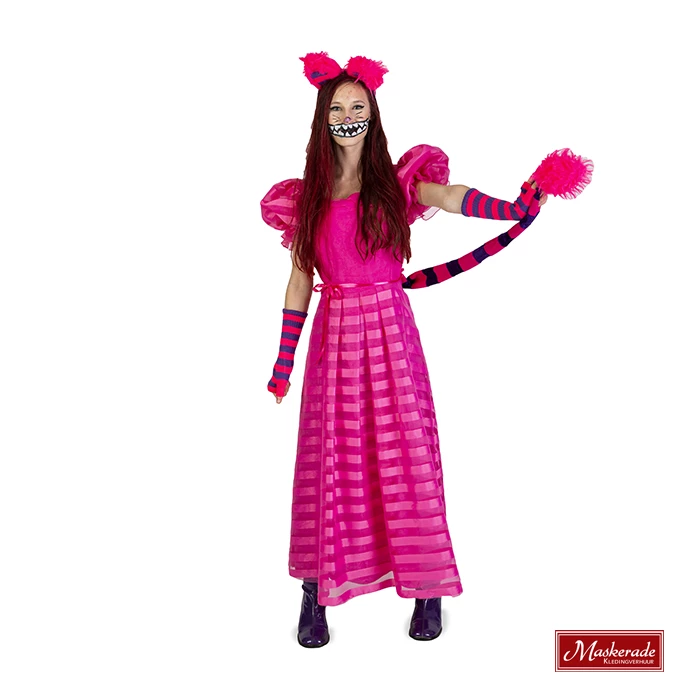Vrouwelijke versie van de Cheshire cat van Alice in Wonderland. Het kostuum bestaat uit een jurk, oortjes, staart en handschoenen.